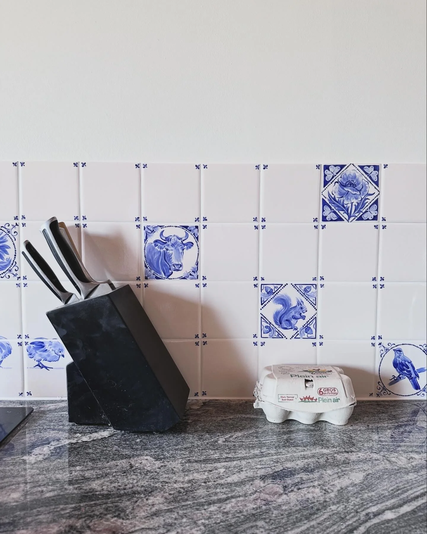 My bespoke kitchen splash back installation in my client’s beautiful countryside kitchen. Each tile represents the wildlife of southern France and their lifestyle living on a farm, showcasing imagery of lambing season, poultry, flora and fauna, wine, and local architecture.